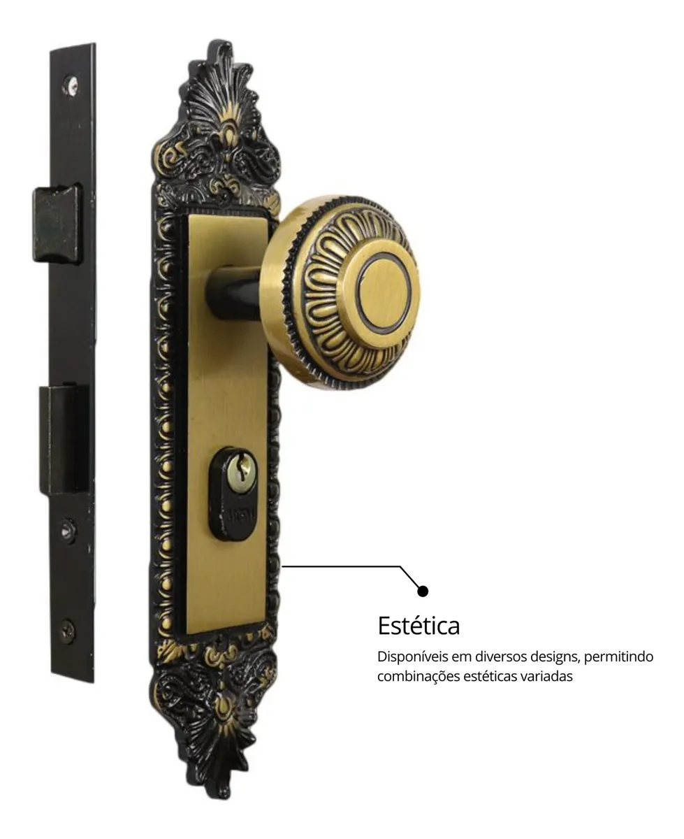 A Fechadura Residencial Colonial 715E22555LO com macaneta bola externa é perfeita para portas de casas, apartamentos ou escritórios, unindo segurança, durabilidade e design clássico.