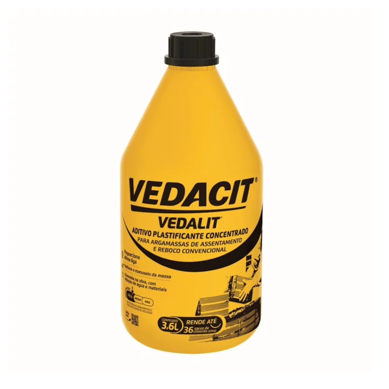 O Aditivo Plastificante Concentrado Vedacit 3,6L é a solução prática e eficiente para melhorar o desempenho de argamassas de assentamento e reboco convencional. Sua fórmula especial atua como plastificante e incorporador de ar, garantindo uma massa muito mais trabalhável, leve e econômica.